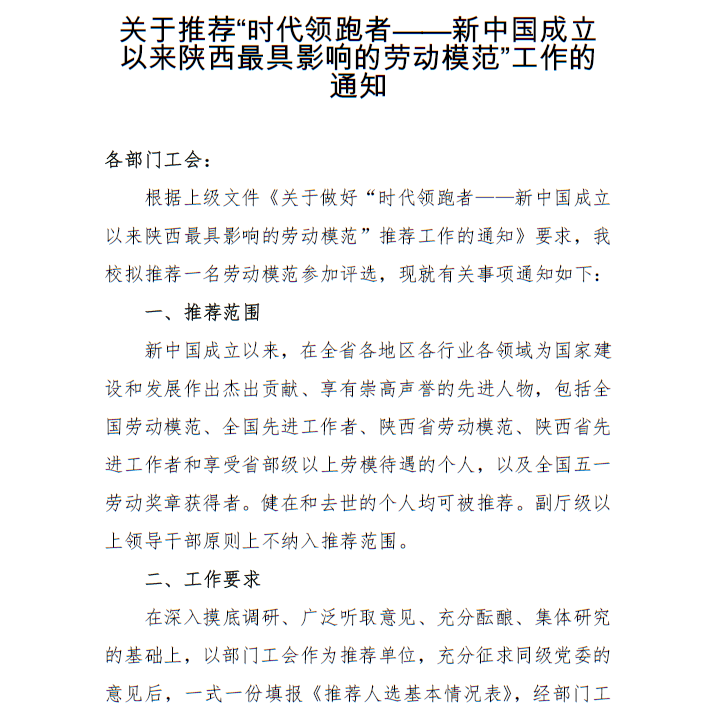 转:关于推荐“时代领跑者——新中国成立以来陕西最具影响的劳动模范”工作的通知